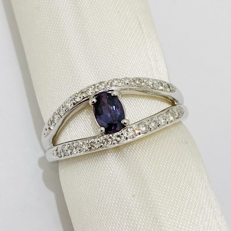 当たる光によって色が変わるといわれているアレキサンドライトのリングでございます。女性らしいデザインでシンプルなのが特徴です。普段使いにも◎