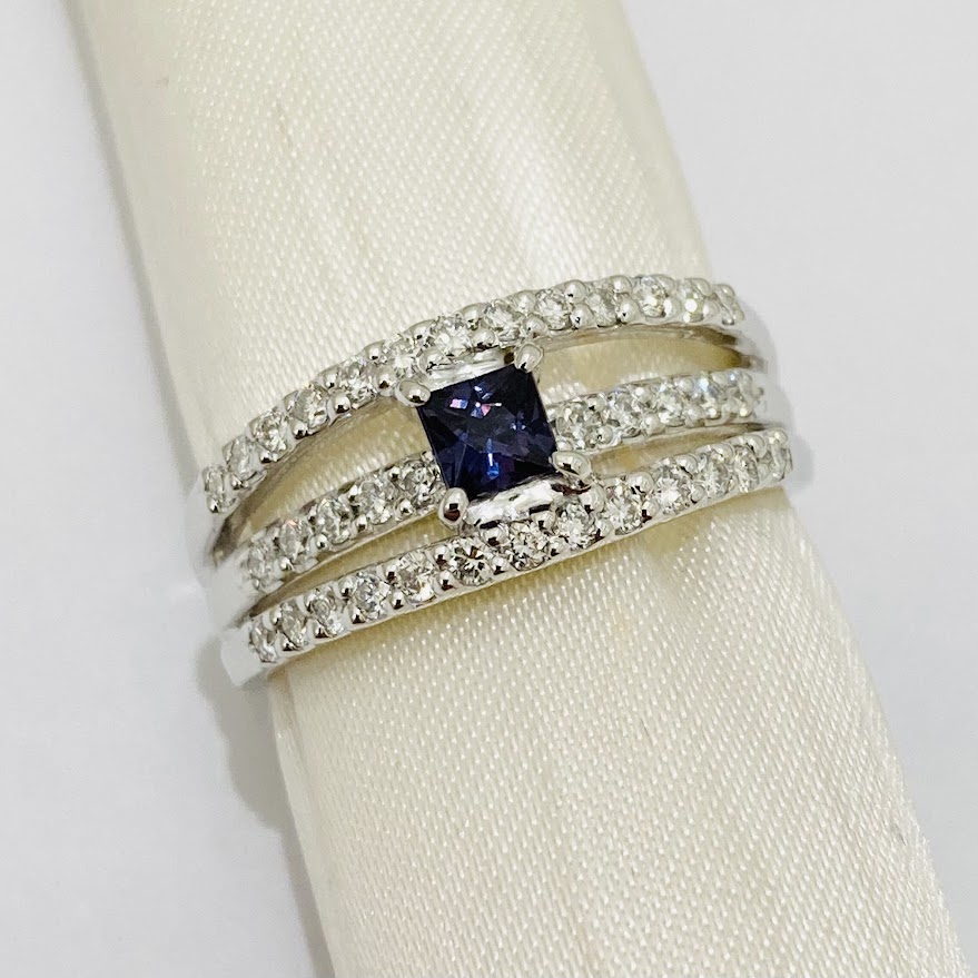 タンザナイトならではの様々な色彩を含んだブルーを楽しめます。シンプルで飽きのこないデザインです。