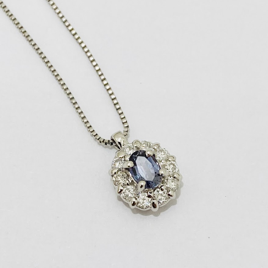 深いブルーが美しいサファイアのネックレスです。ダイヤモンドが上品に輝き、女性らしいデザインになっております。